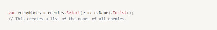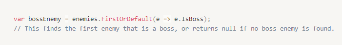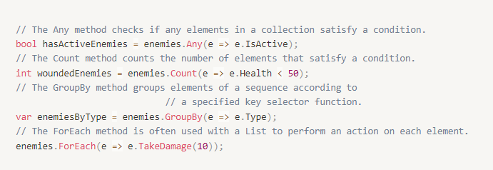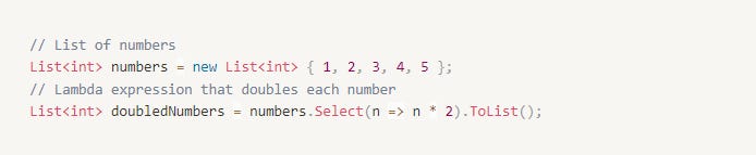 Lambda expressions and LINQ (Language-Integrated Query) are like best friends. LINQ allows you to query collections of data, and lambda expressions allow you to add logic within those queries. Let’s see some of the most common uses of lambda expressions with LINQ.