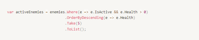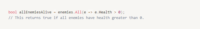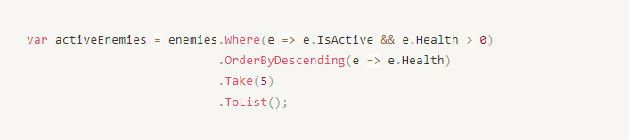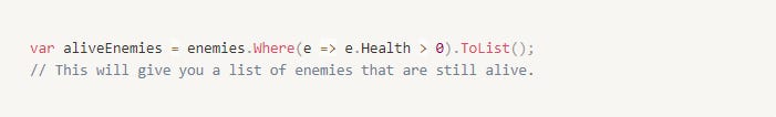 Where(e => e.IsActive && e.Health > 0): Filters the enemies list to only include those that are active and have health greater than 0.
