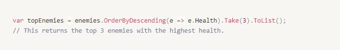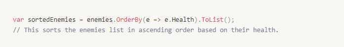 OrderByDescending(e => e.Health): Sorts the filtered list in descending order based on health.